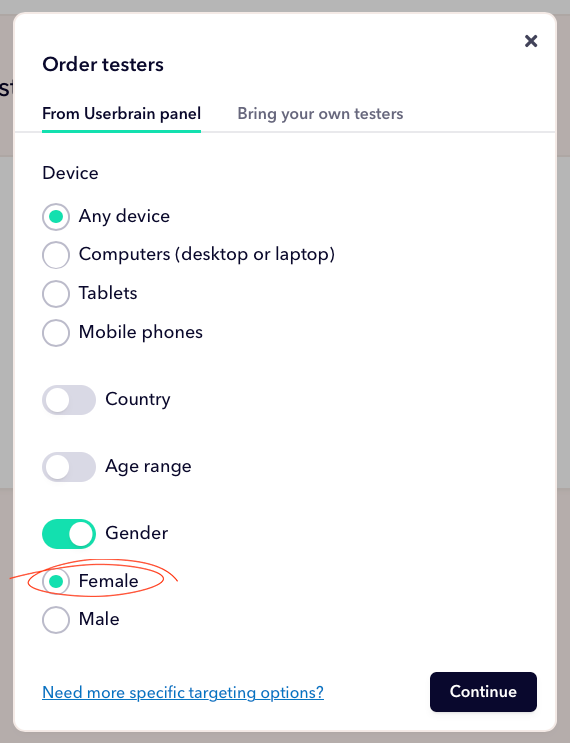 If you want to test with very specific people, you can target them with different demographics. For example, if you’re testing a prototype of a website for woman’s clothes and you want your testers to be exclusively female.