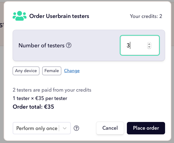 We’re going to select 3 testers, and we want to test our prototype on a desktop device. By clicking on Specify device type you can select the device you want to test on. We’re only going to only desktop devices. Alternatively, you can also choose tablets or mobile, or Get mixed devices. By clicking on Order 3 test videos you submit your order to start testing.