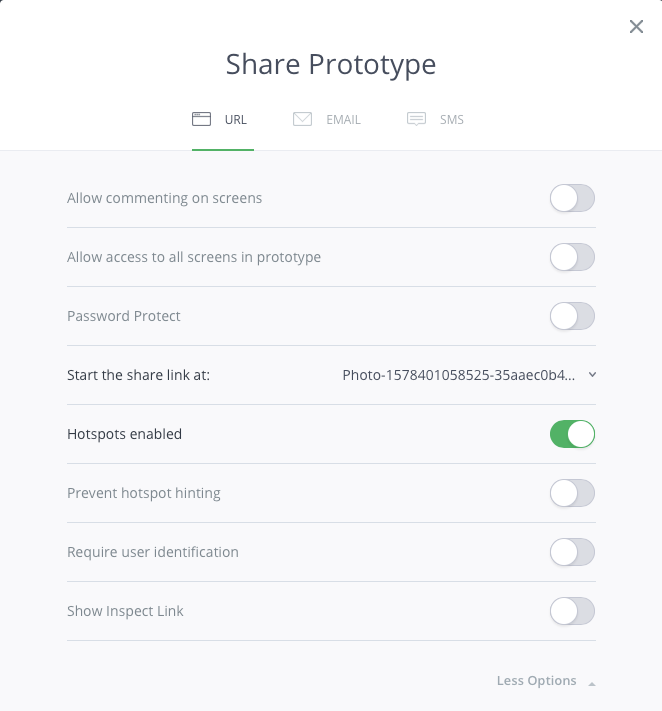 In most cases, a prototype has more than one page. Make sure that you’re selecting the right starting screen of your prototype in the section Start the share the link at:.