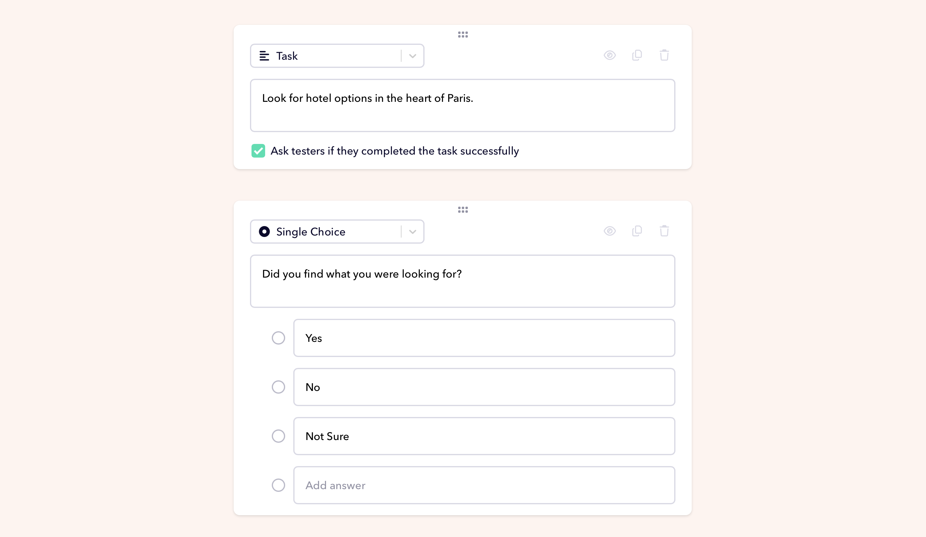 This gives you an explicit split between participants who discovered the feature on their own and those who needed the prompt in Task 2 or 3, without watching every recording to figure it out. Single-choice questions are a standard question type in Userbrain, so you can add one between any two tasks in a few seconds when setting up your test.