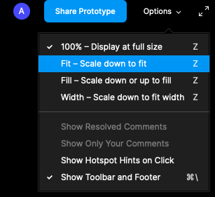 Another important thing when testing your Figma prototype is to choose the correct scale mode. The Scale Mode determines what size your prototype is displayed. The standard setting is 100% – Display at full size – this displays the prototype based on the full size of the frames. This may result in a cropped prototype, depending on the frame and screen size of your participant’s browser. We recommend choosing Fit – Scale down to fit.
